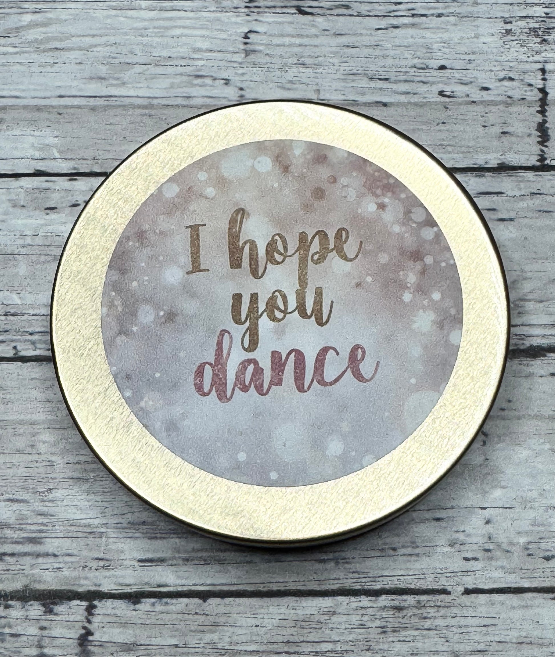 Every time you light this candle, you’re reminding yourself to keep moving, keep dreaming, and never lose your sparkle. The I Hope You Dance candle comes in a radiant gold tin with rose gold accents and graceful script. Infused with a light vanilla scent, it’s your gentle nudge to embrace joy and possibility in every season of life. Handmade with love, this candle shines as a meaningful gift or a daily inspiration for your own journey.